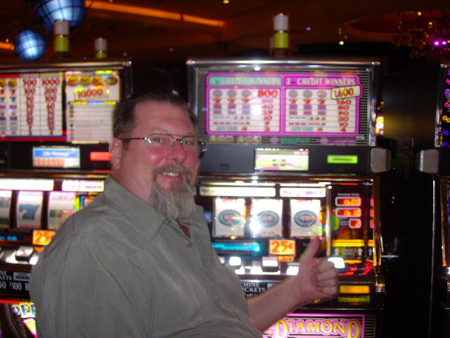 Ryan took me through security and outside of the Casino so we could have a smoke and talk for a while. He then showed me the Poker Room and left me there so he could go back to work. I bought an entry in the 1 O'Clock tourney and sat at a $1-$2 ALL IN table to get a few hands in before the tourney. I took $180 off of the 1-2 table while I waited, and then took 2nd place in the tourney for $159. The Poker Room boss there said I was just a couple of points away from a $50 comp diner and that if I played a bit more... diner would be on the house. So I played a slot machine to get the points and BINGO I hit the JACKPOT on a Double Diamond machine!