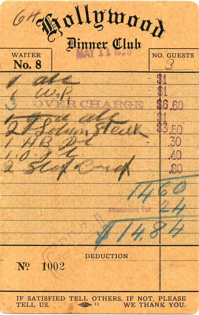 Can anyone read the items on the receipt? It appears that a lobster & steak dinner was $1.75. The covercharge is a killer. Receipts are made of cardboard.